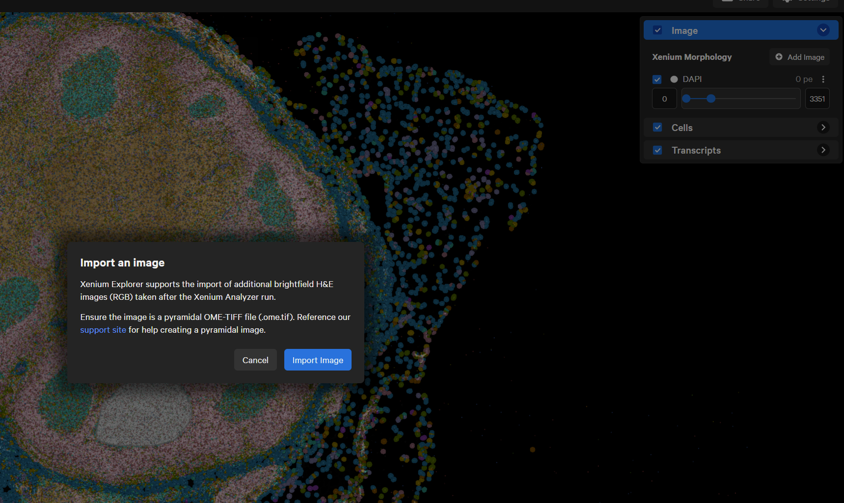 H&E图像需要手动导入到Xenium explorer软件中,并对齐H&E图像与细胞位置图像。